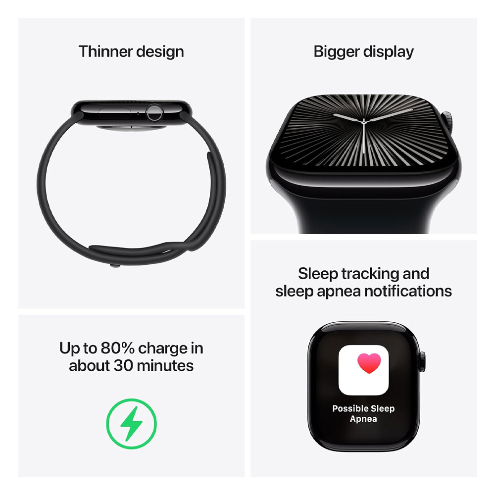 ساعت هوشمند اپل مدل Series 10 با ابعاد 46x39x9.7 میلیمتر و وزن 35.3 گرم، محصولی مناسب برای آقایان و بانوان است که هم در فعالیتهای روزمره و هم در موقعیتهای رسمی و ورزشی قابل استفاده است. جنس بدنه این ساعت از آلومینیوم بوده و در ساخت آن از شیشه Ion-X و سرامیک سافایر بهره گرفته شده است. صفحه نمایش 1.96 اینچی آن از نوع Retina LTPO3 OLED با وضوح 416×496 پیکسل و تراکم 326 پیکسل بر اینچ بوده که قابلیت روشنایی بین 1 تا 2000 نیت را دارد. این ساعت با سیستم عامل WatchOS نسخه 11 و پردازنده Apple S10 عرضه شده و از فناوریهای مکانیابی GPS، A-GPS، GLONASS، GALILEO، BDS و QZSS پشتیبانی میکند.